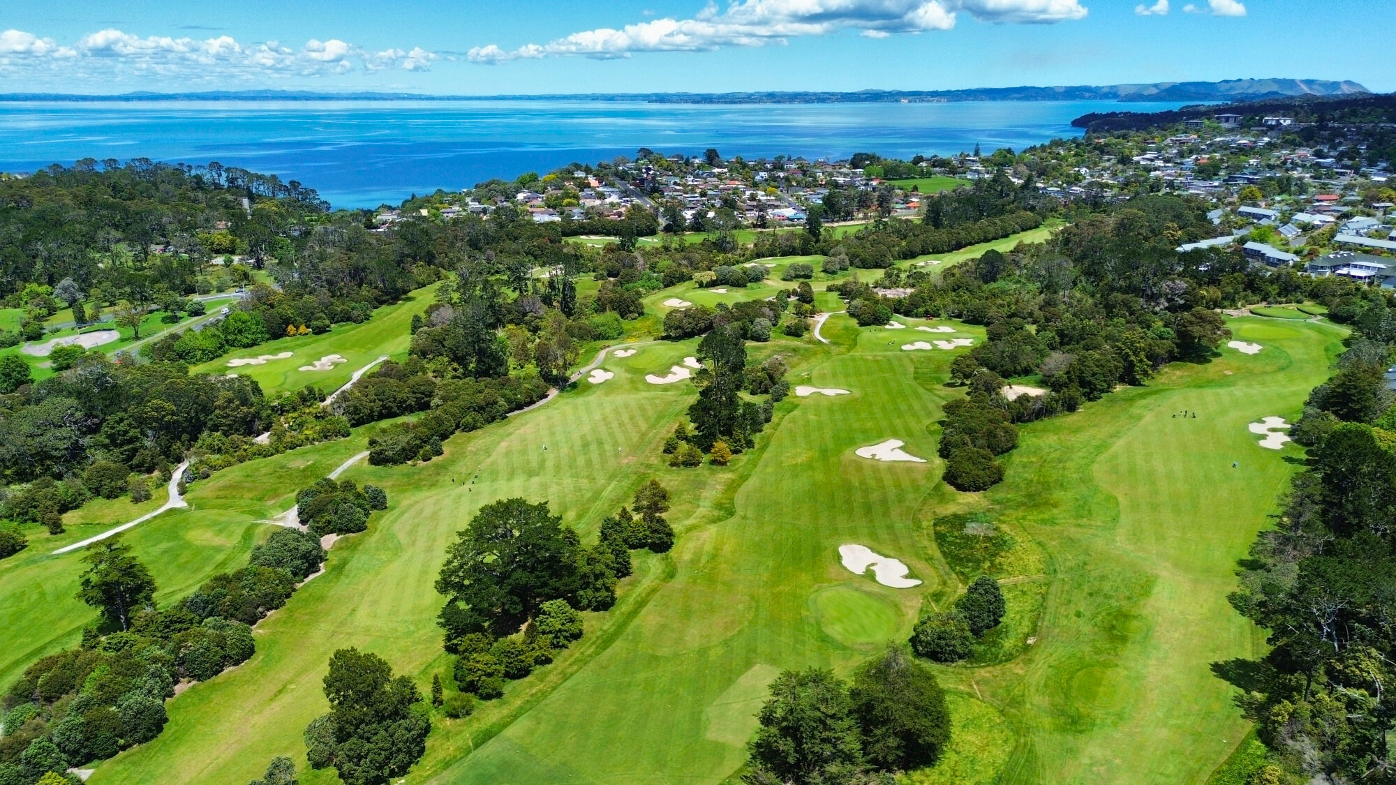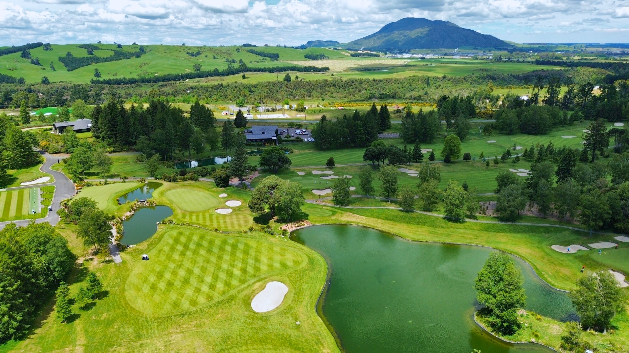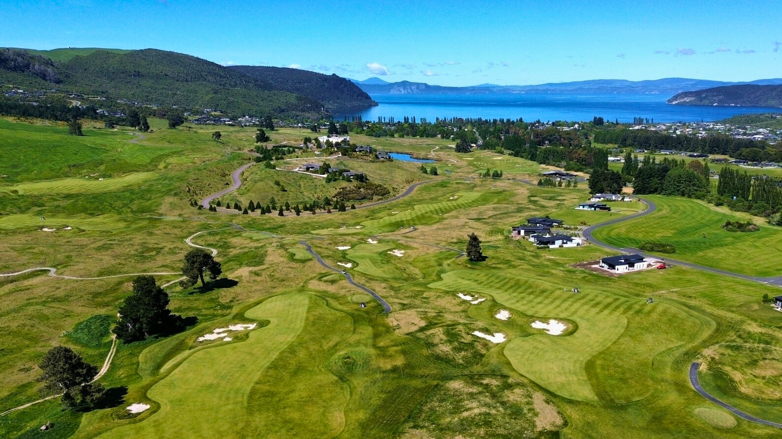 Designed by Jack Nicklaus, the course is set against a breathtaking backdrop: towering hills covered in lush green grass on one side, and the sparkling waters of Lake Taupo on the other.
